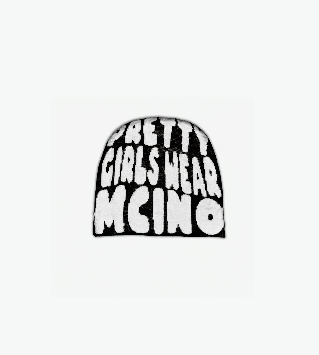 A cuffless beanie crafted from 100% acrylic with a bold branding statement "Pretty Girls Wear MCINO" in white.