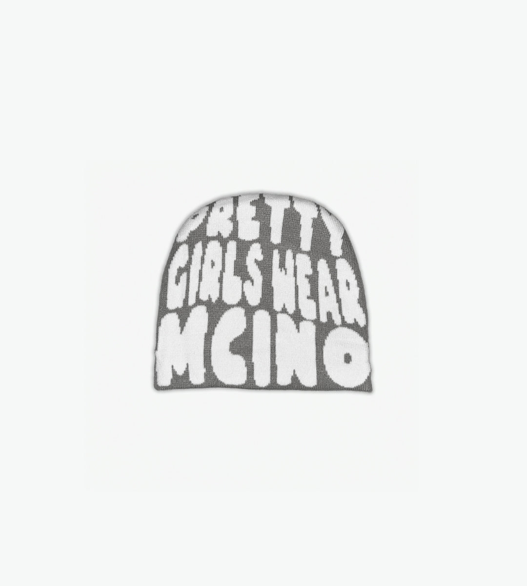 A cuffless beanie crafted from 100% acrylic with a bold branding statement "Pretty Girls Wear MCINO" in white.